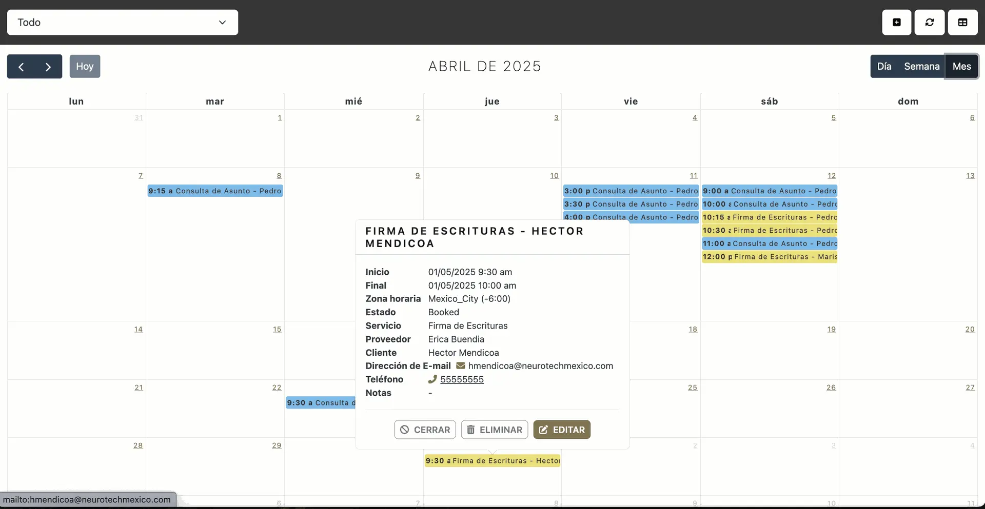 Cada vez que un cliente hace un reserva con alguien, el cliente y el proveedor de servicio reciben un correo confirmando la cita. Adicionalmente en el calendario del proveedor de servicio y el calendario global de tu negocio puedes ver todas las reservas existentes.
